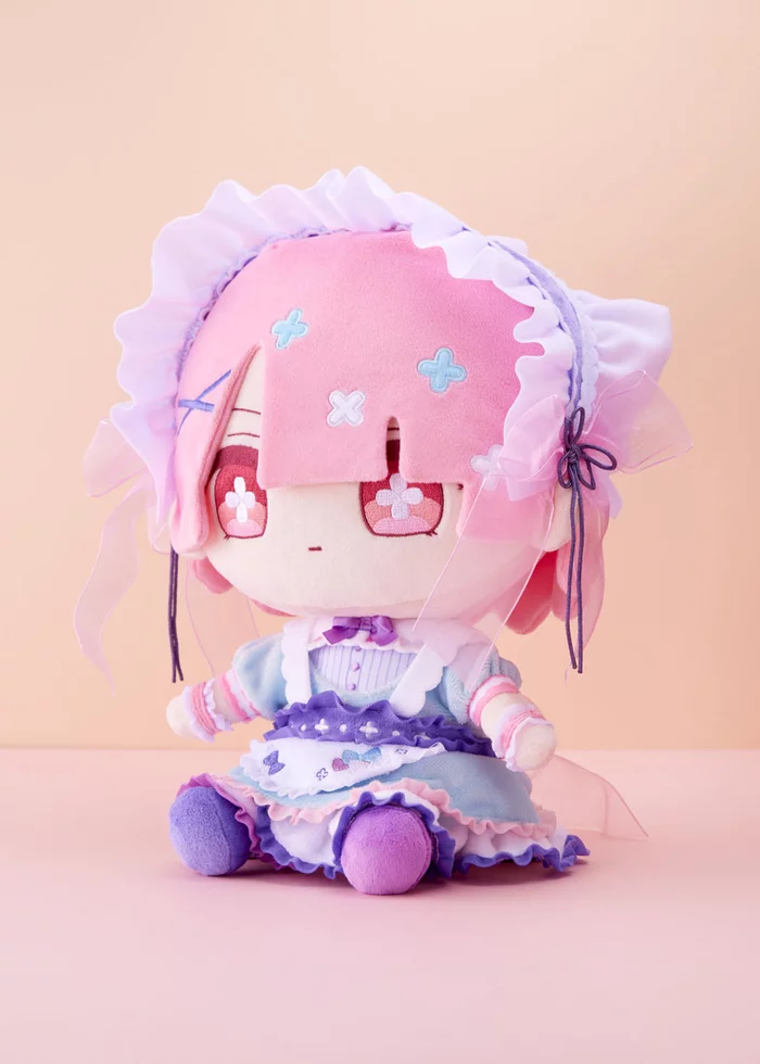 Additional details include the light blue flowers scattered throughout her hair, which are reminiscent of her sister Rem, her frilly headdress adorned with ribbons tied in the shape of flowers, and the big transparent ribbon on her back. Her big, sparkling embroidered eyes and cute staring expression are sure to soothe you, so be sure to invite her over to your place!