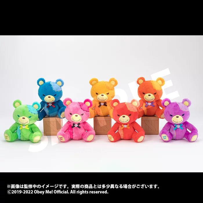 From the popular otome game Obey Me! come plush teddy bears themed after the rare teddy bear items that appear in-game! Each cuddly, colorful bear measures 5.9″ tall and is themed after a different demon brother. Details include their creepy cute smiles, the patchwork details on the ear and torso, a ribbon on their chest, and the game’s name embroidered on the bottom of the right foot. Though they look cute on their own, they’re even better together, so be sure to collect your favorites!