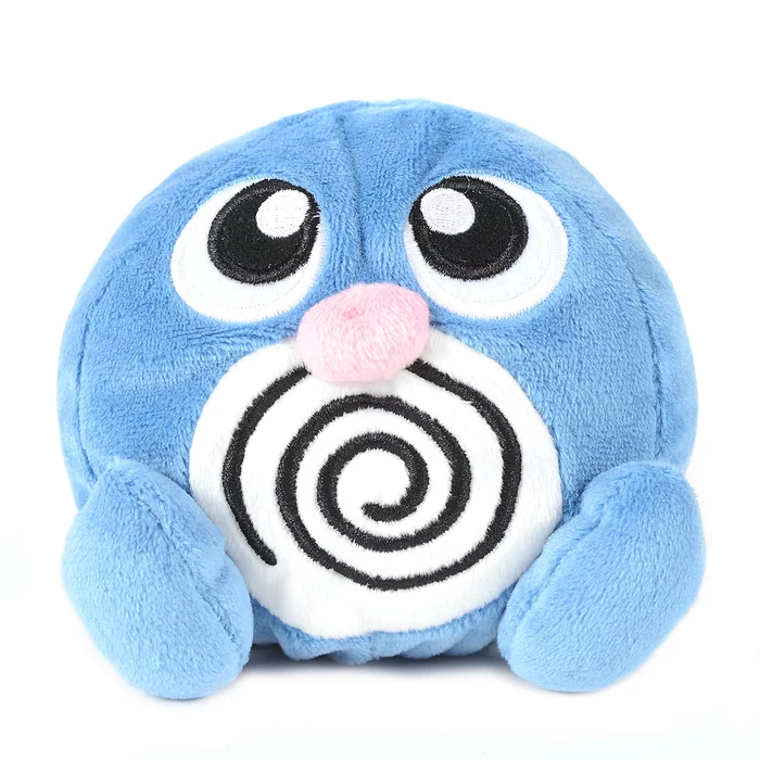 This plushie is of the Generation I Pokémon Poliwag. Since it is more adept at swimming then walking on land, it seems to be sitting down to take a short rest. Awfully dry for a Water type, it is **soft all over **and has a plush tail as well as embroidered eyes and an embroidered swirl on its abdomen! Measures 5”.