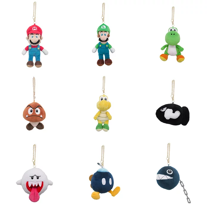It’s-a plushie mascots of all the awesome characters you love seeing when you play Super Mario All-Stars! Made by San-Ei, each soft plush comes with a mini chain attached. Choose from Mario, Luigi, Yoshi, Goomba, Koopa Troopa, Boo, Bullet Bill, Bob-omb, or Chomp!